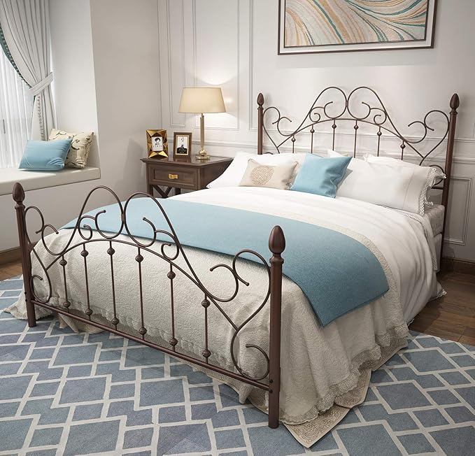 Featuring a solid metal construction boasting an antique brown finish, this victorian style headboard is an eye catching.